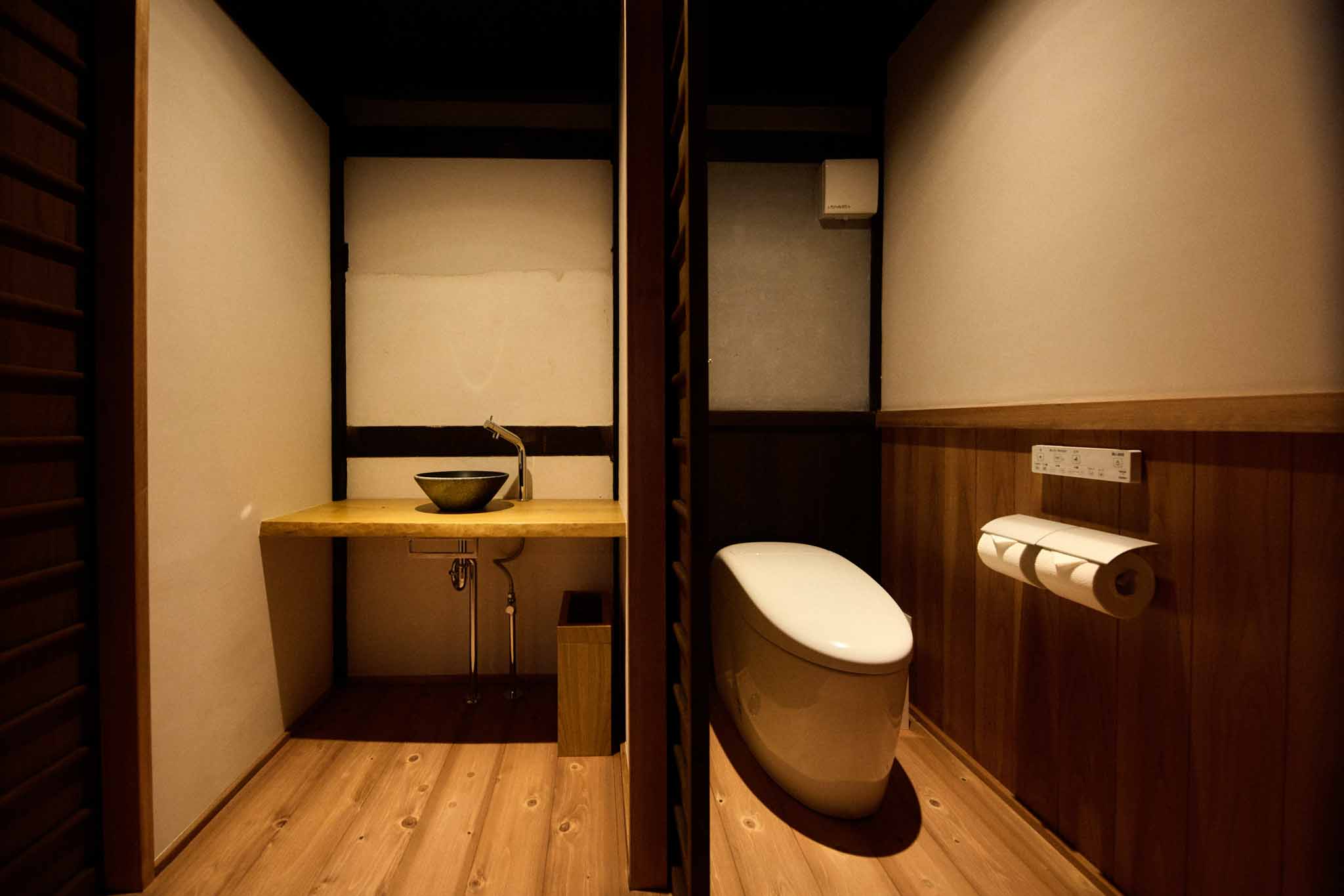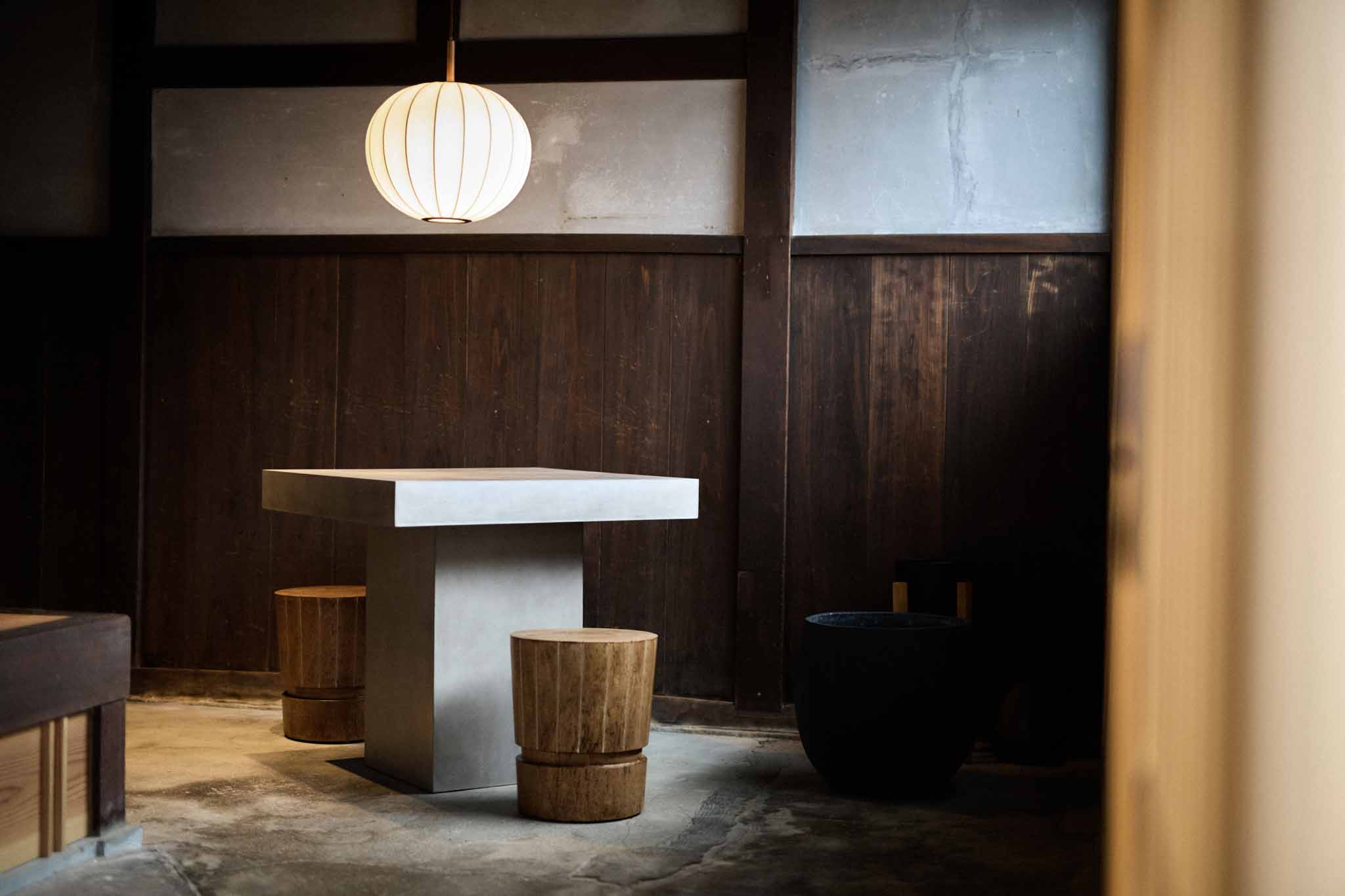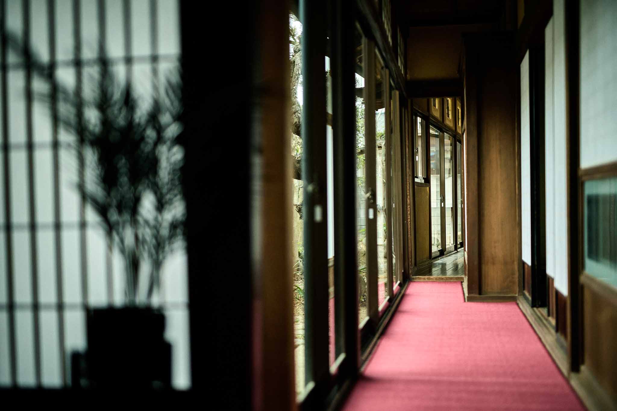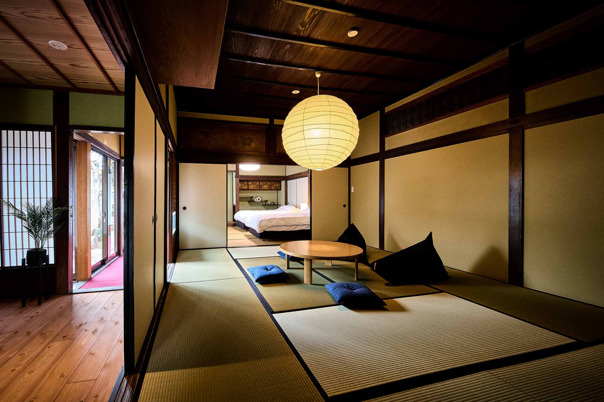 フロント棟から徒歩1分の場所に位置する、大正3(1914)年築、111 年の歴史ある古民家を改修した客室棟です。商家として栄えた贅沢な作りで、鼻隠しのアーチ型が印象的な建物です。102では、入り口すぐに立派な大黒柱があります。