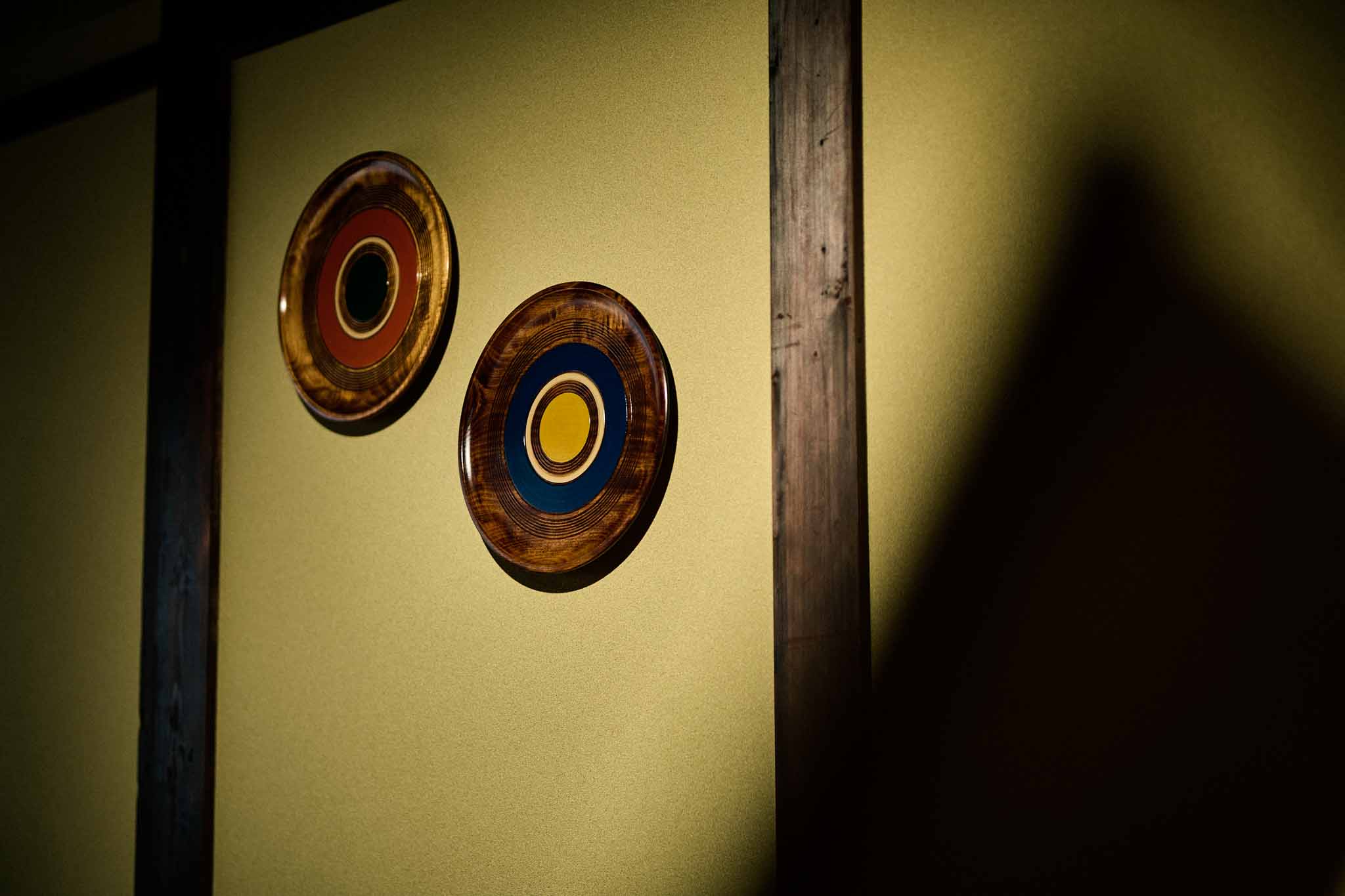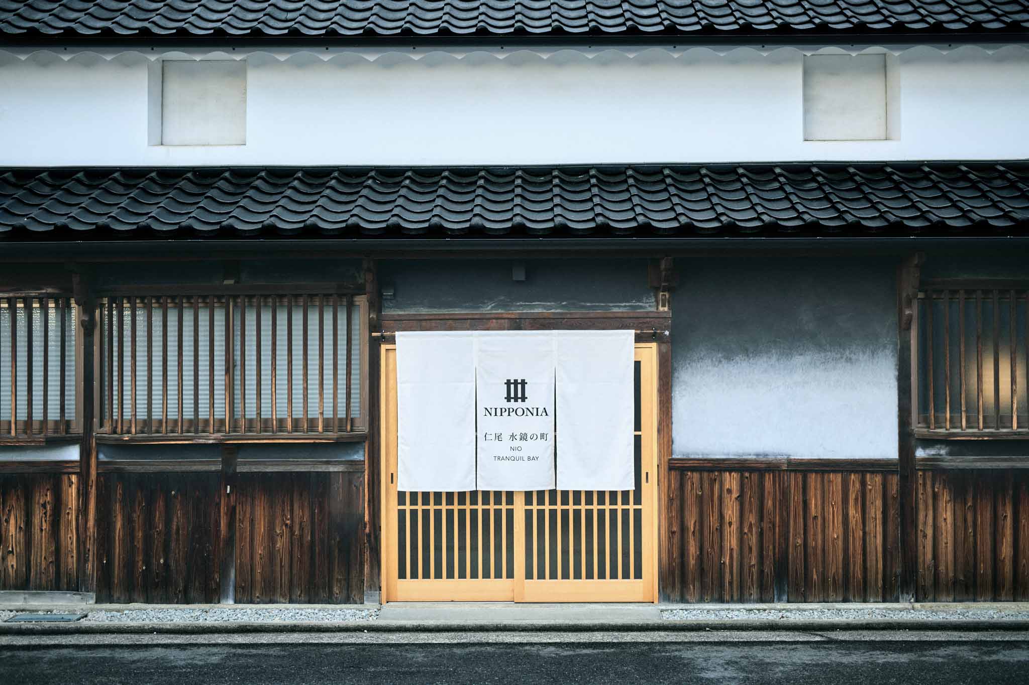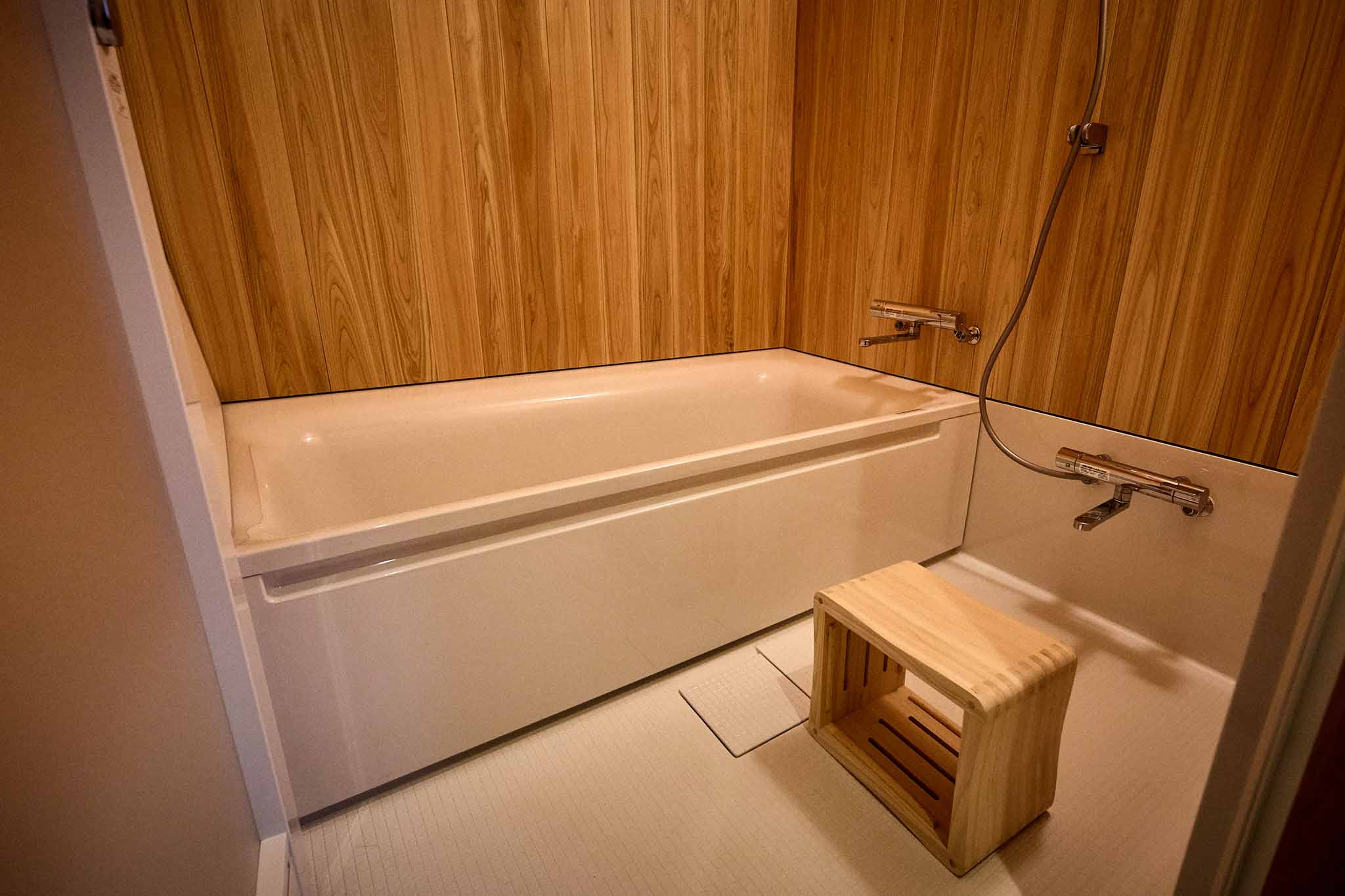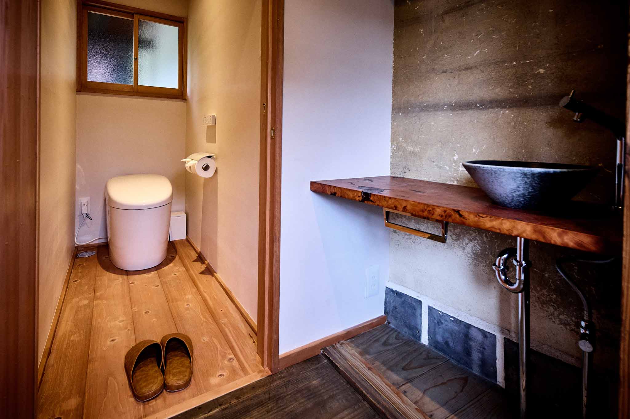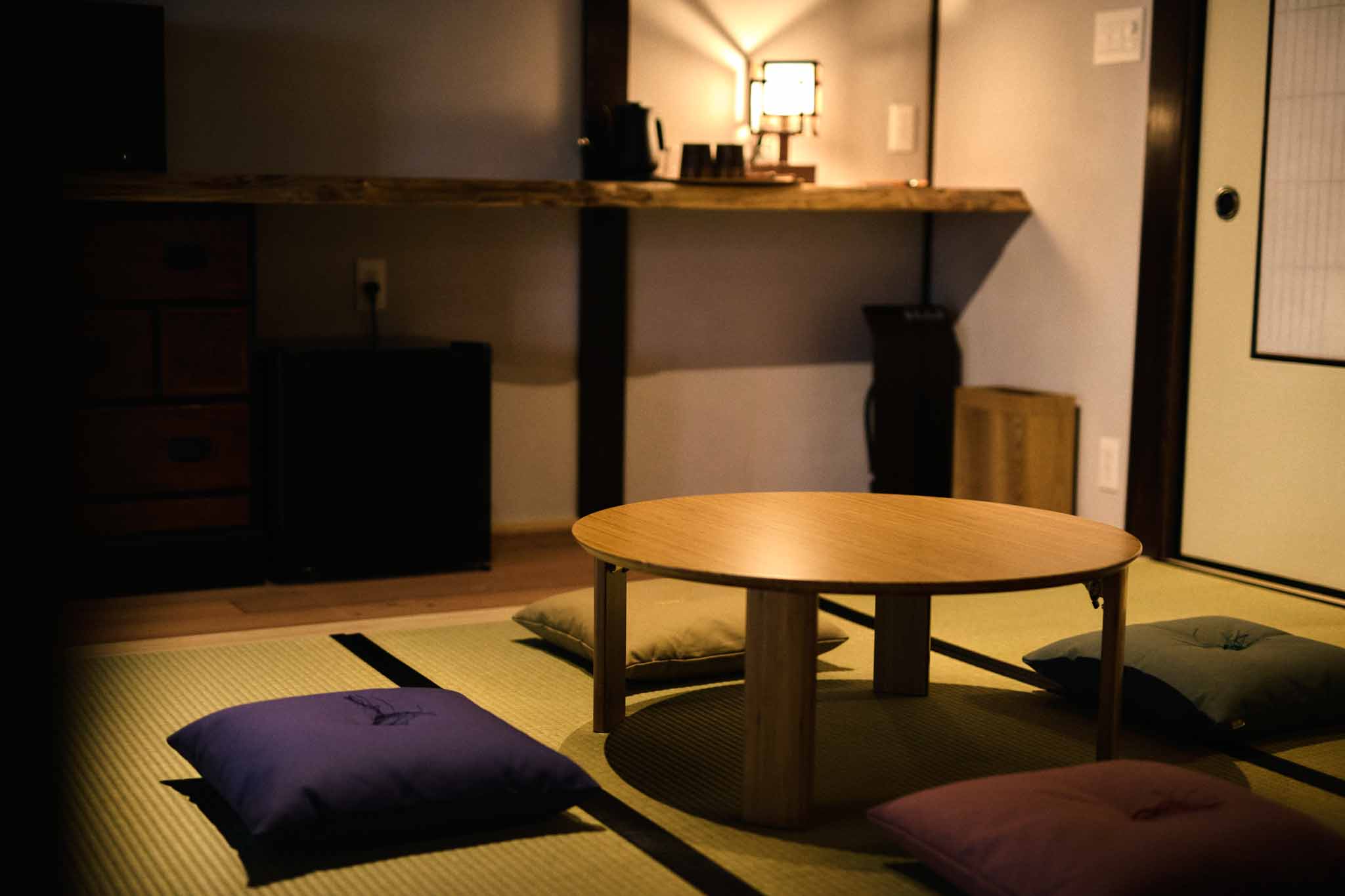 フロント棟から徒歩1分の場所に位置する、大正3(1914)年築、111 年の歴史ある古民家を改修した客室棟です。商家として栄えた贅沢な作りで、鼻隠しのアーチ型が印象的な建物です。102では、入り口すぐに立派な大黒柱があります。