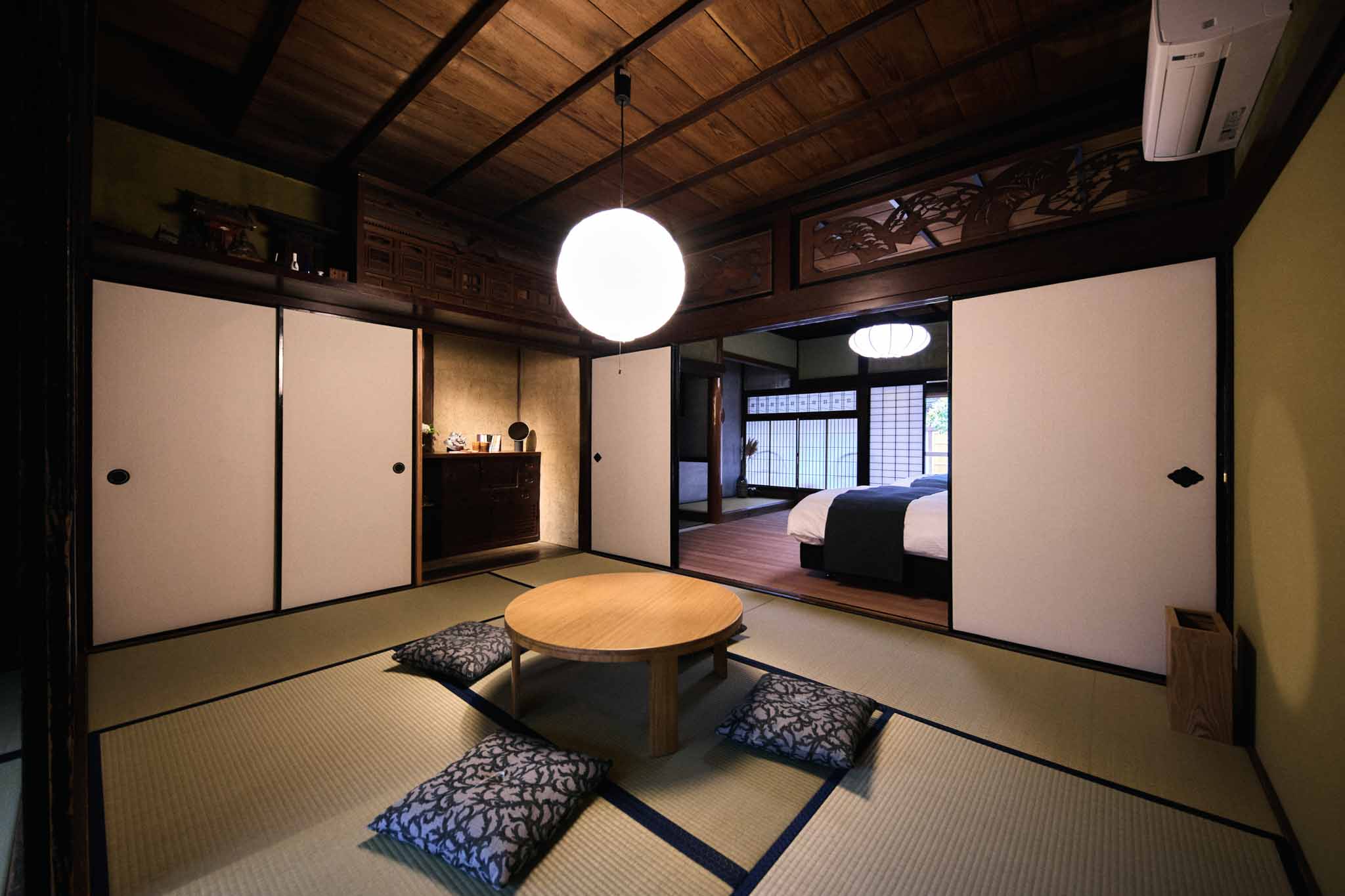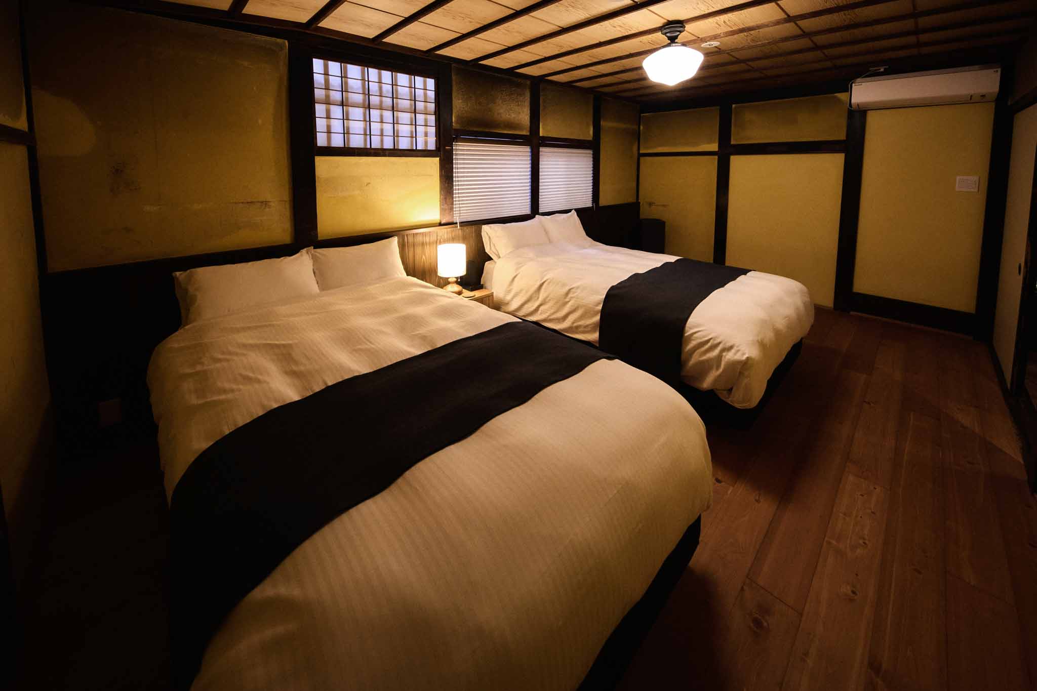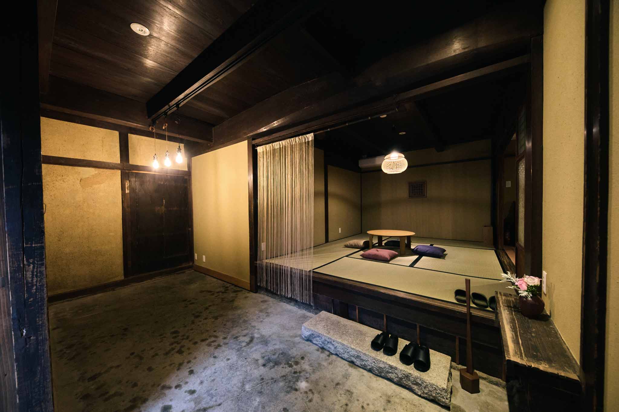 フロント棟から徒歩3分の場所に位置する、明治37年(1904)年築、121年の古民家を改修した客室棟です。米問屋として地域を支えてきた佇まいは、本瓦葺きが印象的な建物です。201では中庭が見渡せます。