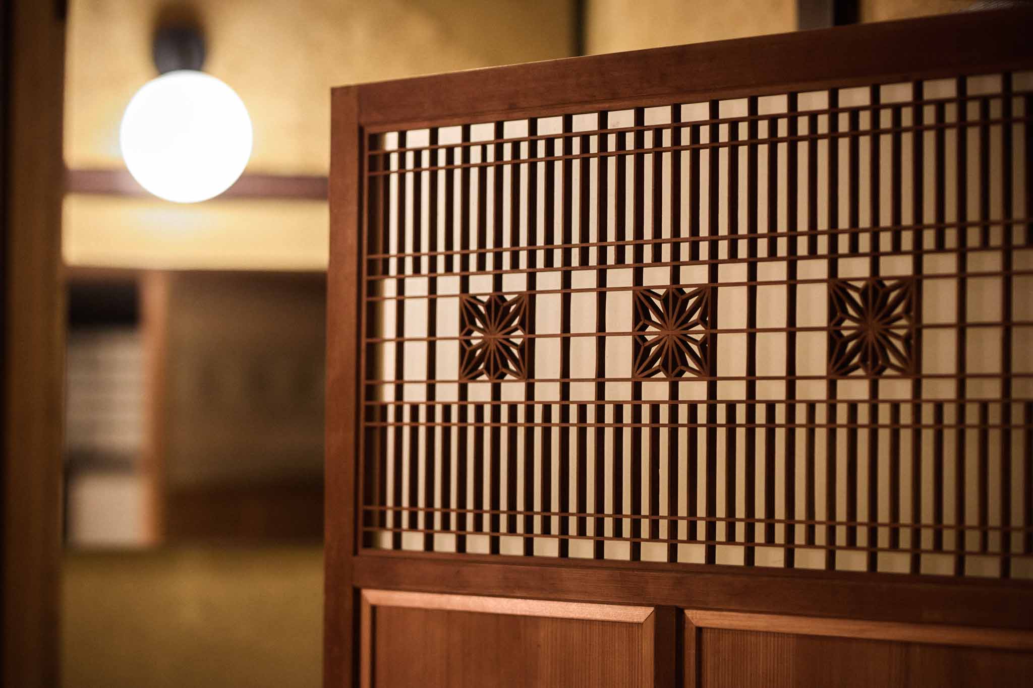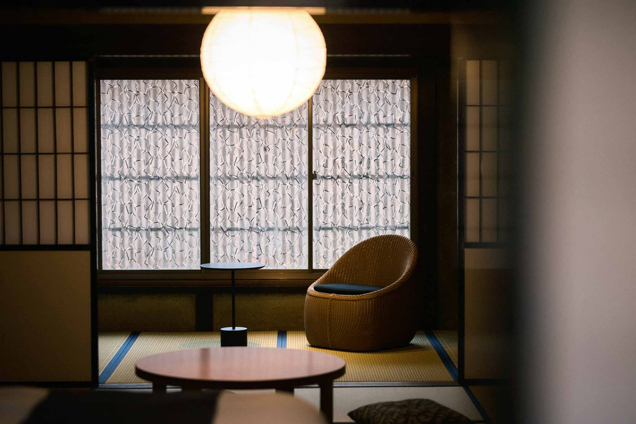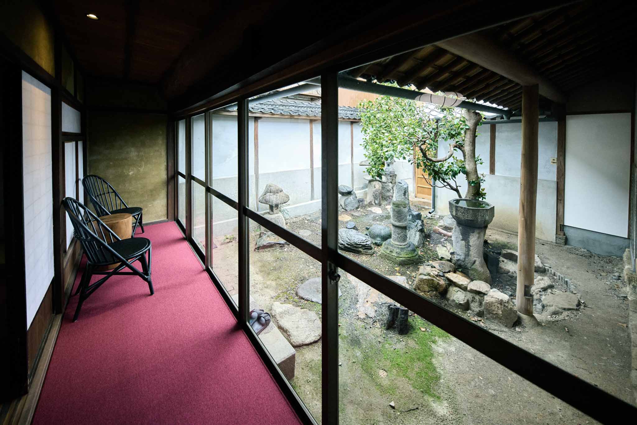 フロント棟から徒歩3分の場所に位置する、明治37年(1904)年築、121年の古民家を改修した客室棟です。米問屋として地域を支えてきた佇まいは、本瓦葺きが印象的な建物です。201では中庭が見渡せます。